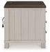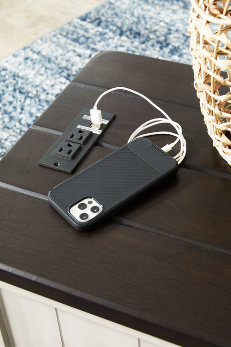 Make a farmhouse-inspired statement with this end table. Beautifully crafted to stand the test of time, the planked effect and clean two-tone finish lend a relaxing vintage feel. Spacious storage drawers with metal pulls double up on form and function. Plus, this end table's dual USB charging ports keep up with your high-tech lifestyle.
